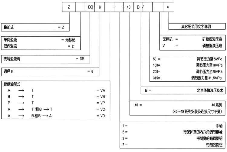 ZDB/Z2DB型溢流阀是叠加式先导溢流阀,用于限制系统压力。有五种控制形式和四个压力等级。