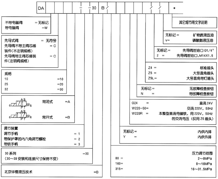 这类型阀主要由先导阀、主阀和单向阀组成。DA10型的单向在主阀体内,DA20和DA30型的单向阀在主阀底部的底板内。