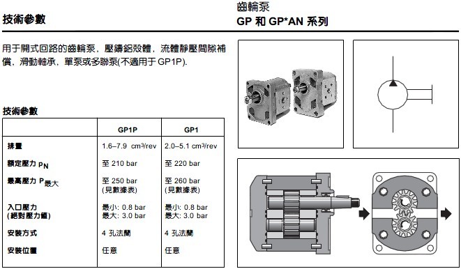 Parker派克GP和GP*AN系列齿轮泵是用于开式回路的齿轮泵,压铸铝壳体,流体静压间隙补偿,滑动轴承,单泵或多联泵。此系列齿轮泵的特点有:高精加工的齿轮副。特殊的生产技术使彼此间的密封间隙最小。用于静压间隙补偿的端面压力区域带有密封件。通过选择最佳的齿数使得泵的流量脉动小并且噪音低。高压采用用于高载荷的滑动轴承采用压铸铝的泵体使得泵的重量轻。排量为1.6-87.6ml/rev,额定压力至230bar,最高压力可达270bar。